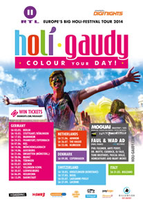 Es wird bunt: HOLI GAUDY Festival-Tour 2014das Jahr 2014 wird bunt: RTL II und diginights präsentieren die HOLI GAUDY Festival-Tour. Die europäische Variante des indischen Frühlingsfestes geht ab Anfang Mai 2014 auf Tournee, mit über 30 Terminen in Deutschland, der Schweiz, den Niederlanden, Dänemark und Italien. Unter dem Motto Colour Your Day lädt die HOLI GAUDY …News lesen -