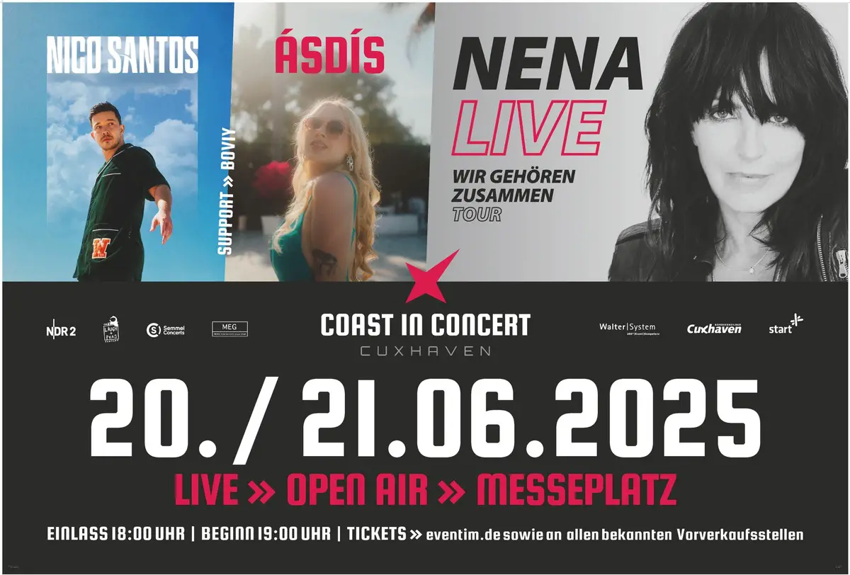 Cuxhaven: COAST IN CONCERT holt NENA, Nico Santos und ÁSDÍSCuxhaven wird zur Konzertzone! Mit COAST IN CONCERT startet ein neues Musikfestival direkt an der Nordseeküste. Der Messeplatz verwandelt sich in eine riesige Open-Air-Bühne, auf der Top-Acts für Stimmung sorgen. Am Freitag, den 20. Juni 2025, gibt Nico Santos den Auftakt. Der Musiker bringt seine größten Hits mit und sorgt …News lesen -